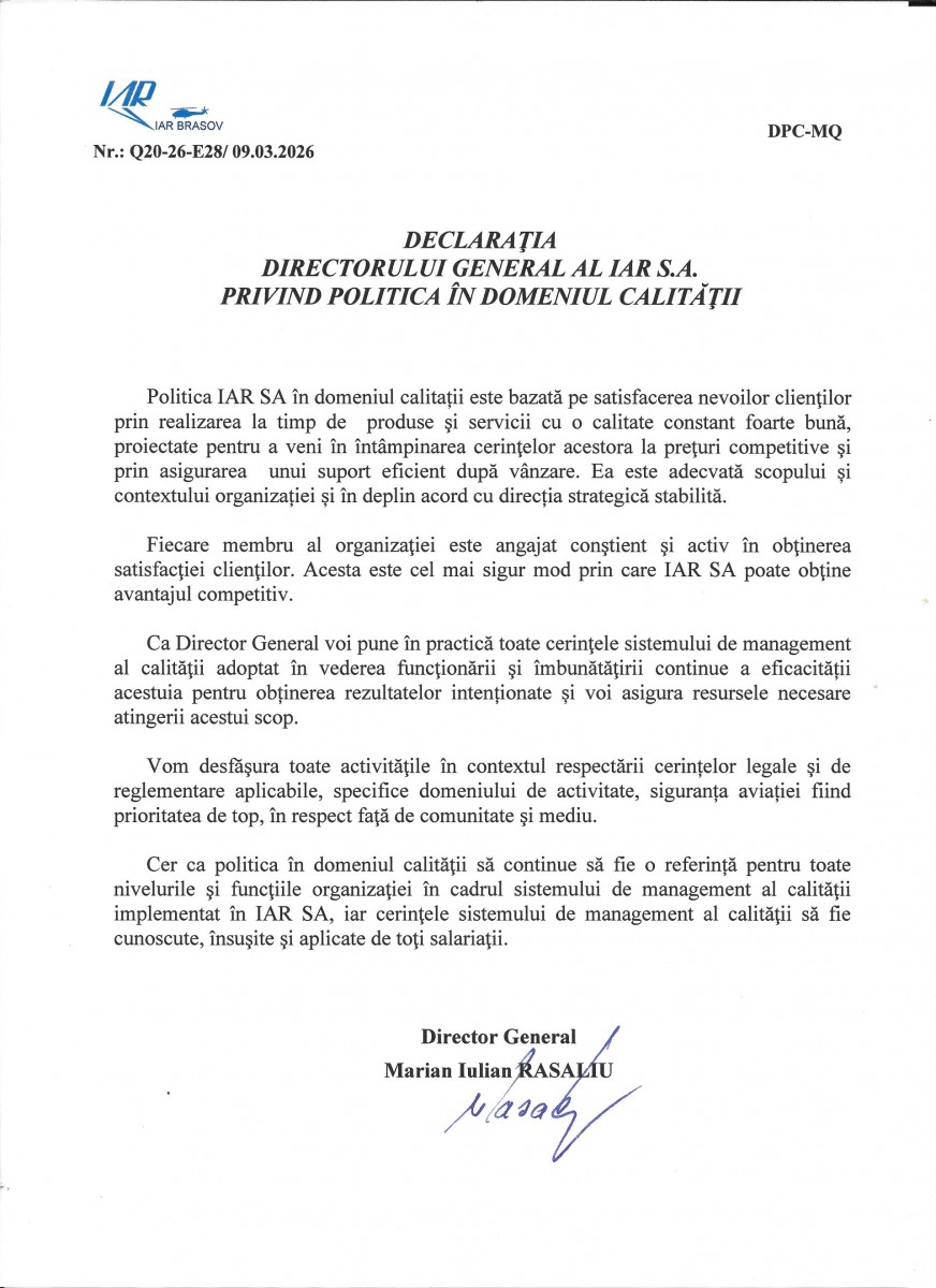 Asigurarea aeronavigabilitatii produselor realizate de IAR S.A. este făcută prin Colectiv de Aeronavigabilitate-structura organizațională proprie constituită din personal înalt calificat, cu dotări și echipamente adecvate, având responsabilități, proceduri și resurse pentru a îndeplini cerințele și obiectivele asigurării aeronavigabilitatii aeronavelor.