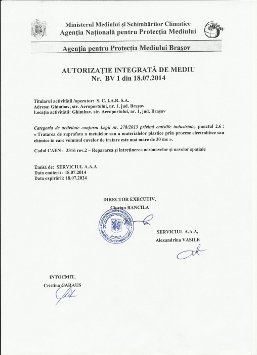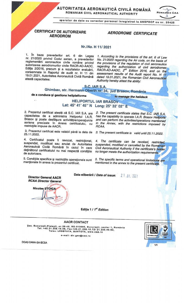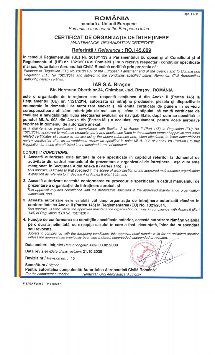 IAR S.A. is certified as maintenance organization in compliance with Section A of Annex II (Part 145) of Regulation (EC) No. 1321/2014 by Romanian Civil Airworthiness Authority.