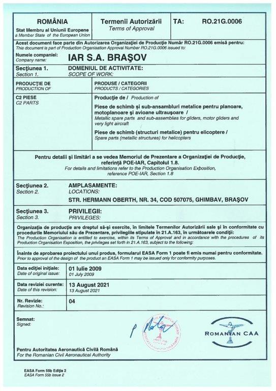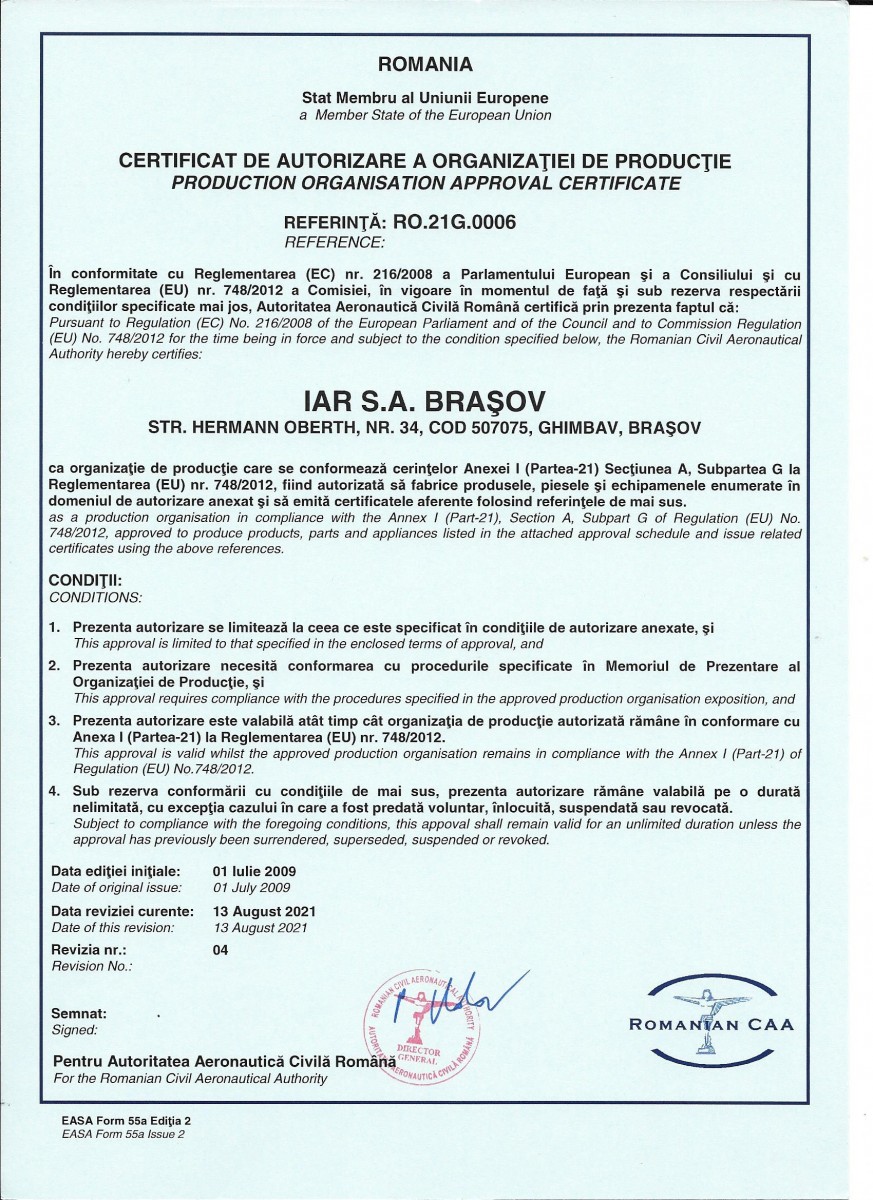IAR S.A. is certified as production organization in compliance with Annex (Part 21) Section A, Subpart G of Regulation (EC) No. 748/2012 by Romanian Civil Airworthiness AUthority..